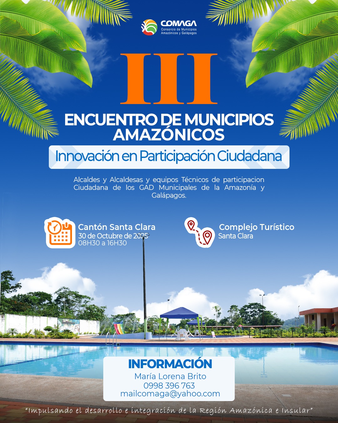 El ยซEncuentro de Municipios Amazรณnicos: Innovando en Participaciรณn Ciudadanaยป es una serie de eventos organizados por el Consorcio de Municipios Amazรณnicos y Galรกpagos (COMAGA), con el objetivo de discutir y compartir experiencias sobre la participaciรณn ciudadana, especialmente a travรฉs de medios electrรณnicos y la gestiรณn pรบblica local. El segundo encuentro se realizรณ en noviembre de 2024 en Baรฑos y el primero en 2023 en el Cantรณn Shushufindi.