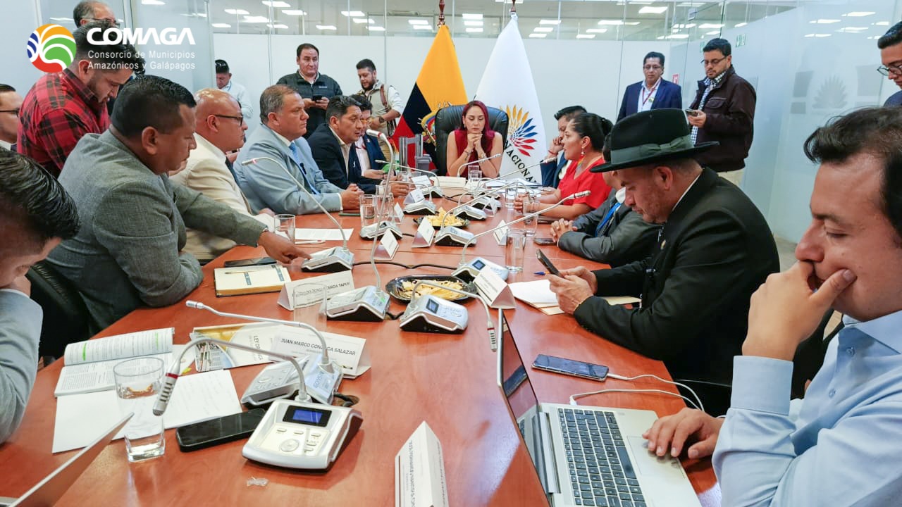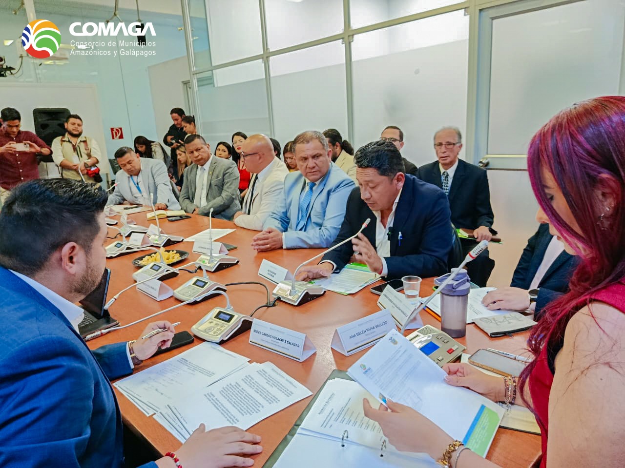 El presidente del Consorcio de Municipios Amaz贸nicos y Gal谩pagos (Comaga) y alcalde de Santa Clara, Ing. C茅sar Castro, acompa帽ado de los burgomaestres de Ba帽os de Agua Santa, Marlon Guevara y de Penipe, Fabi谩n Aldaz, fueron recibidos en la sesi贸n del Grupo Parlamentario Amaz贸nico en la Asamblea Nacional para tratar las reformas a la Ley para Planificaci贸n de la Circunscripci贸n Territorial Amaz贸nica.