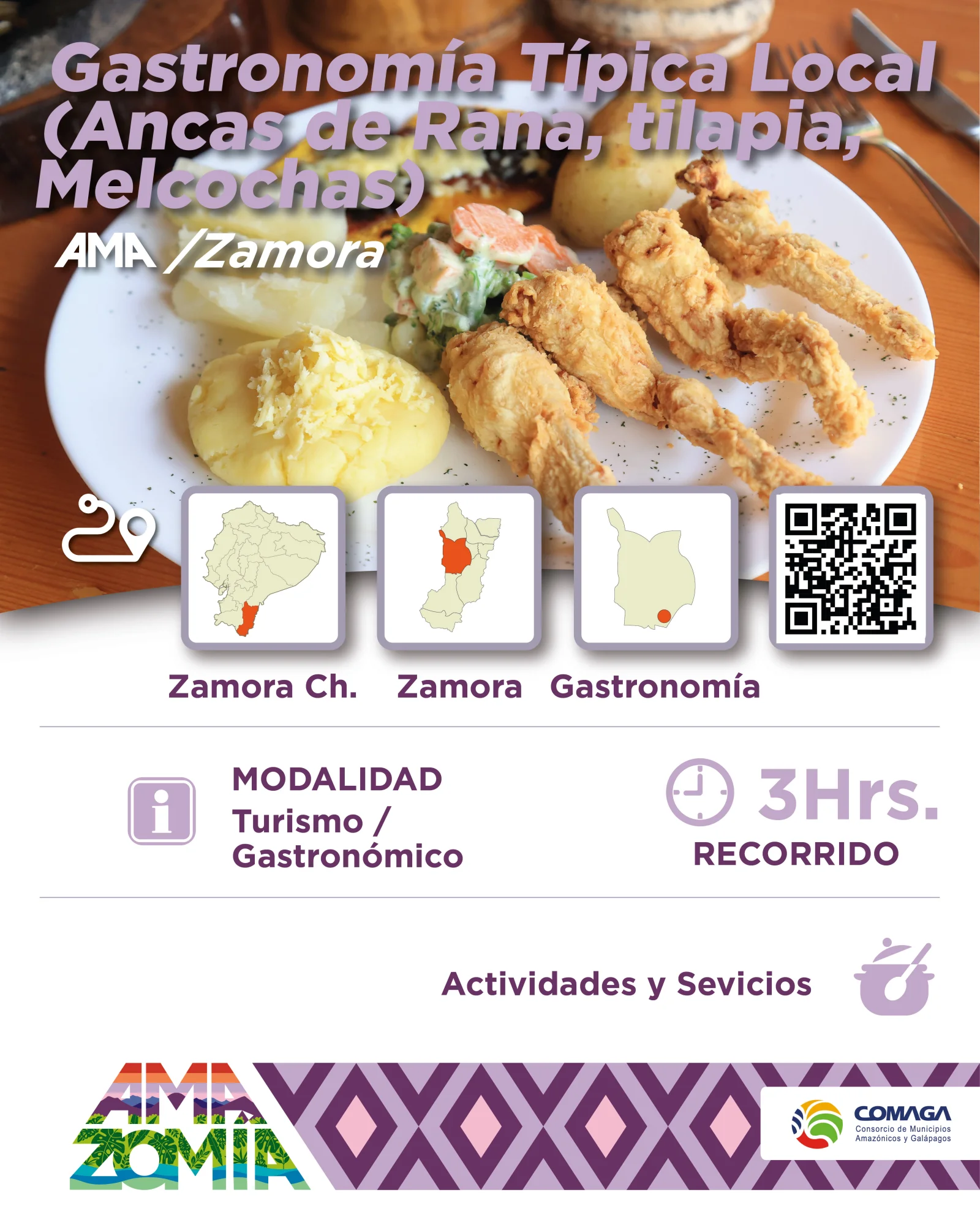 Zamora es considerada como un paraíso selvático, cuya flora y fauna tropicales, ejercen una deslumbrante atracción en sus valles que se extienden pasadas las estribaciones de las cordilleras sub-andinas. La naturaleza y amabilidad de sus habitantes se complementa con su excelente gastronomía, en platos típicos de pescados como la tilapia, la carpa, y las deliciosas y exóticas ancas de rana. Dejarse atrapar por el encanto de la espesa vegetación y transitar por sus paisajes resulta una aventura de ensueño.