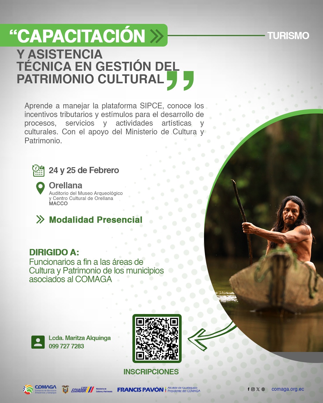 El Consorcio de Municipios Amazónicos y Galápagos, COMAGA, en colaboración con el Ministerio de Cultura y Patrimonio, desarrolla un taller integral sobre gestión del patrimonio cultural. Esta capacitación está diseñada para fortalecer nuestras raíces y proteger nuestra herencia cultural.