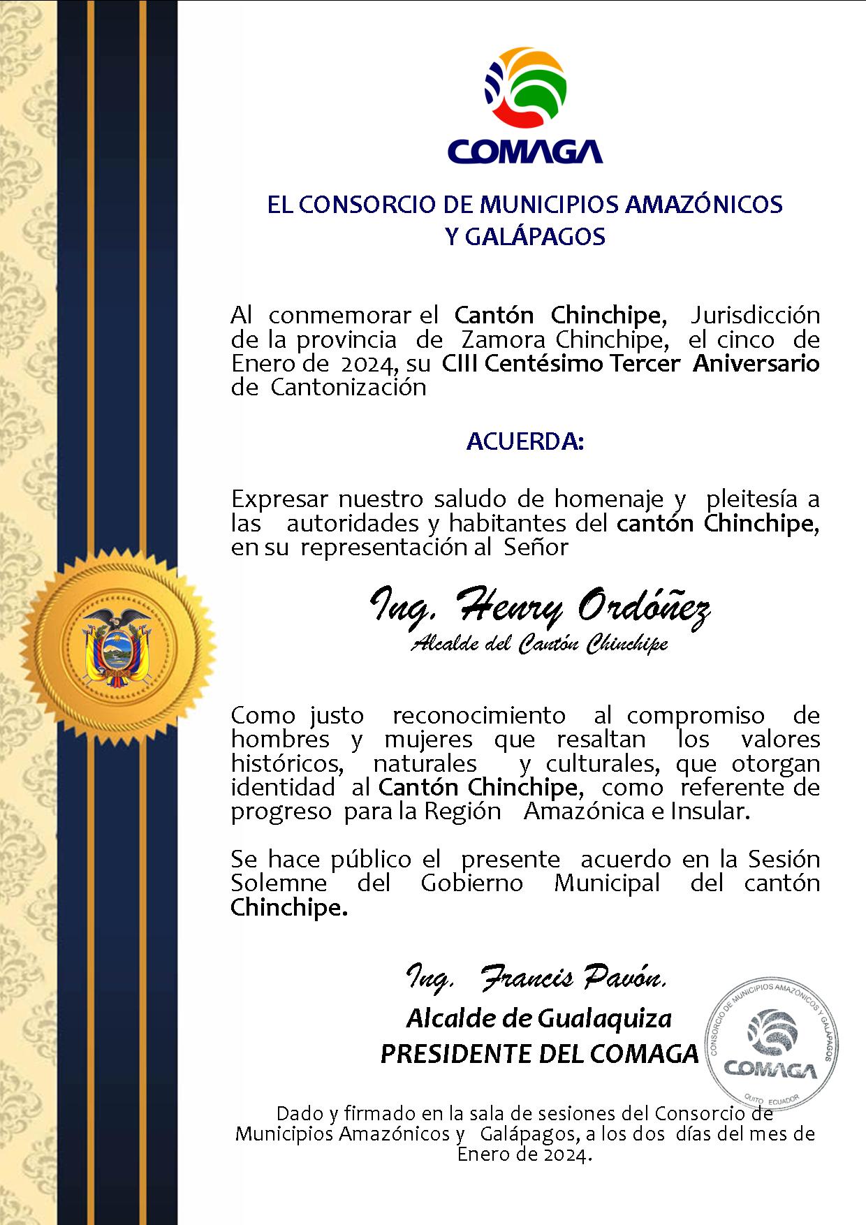 #Efemérides/El Consorcio de Municipios Amazónicos y Galápagos COMAGA rinde homenaje a Chinchipe en la provincia de Zamora Chinchipe al celebrar su centésimo tercer aniversario de cantonización y saluda al noble pueblo por intermedio de su Alcalde Henry Ordóñez.
