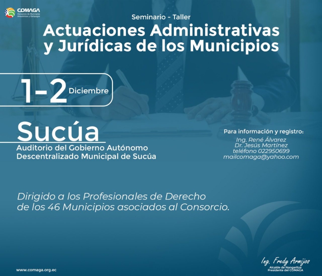 El Consorcio de Municipios Amazónicos y Galápagos, desarrollará el Seminario Taller “Actuaciones Administrativas y Jurídicas de los Gobiernos Autónomos Descentralizados Municipales” los días uno y dos de diciembre del presente año, en el cantón Sucúa, dirigido a los profesionales de Derecho de los 46 Municipios asociados al Consorcio.