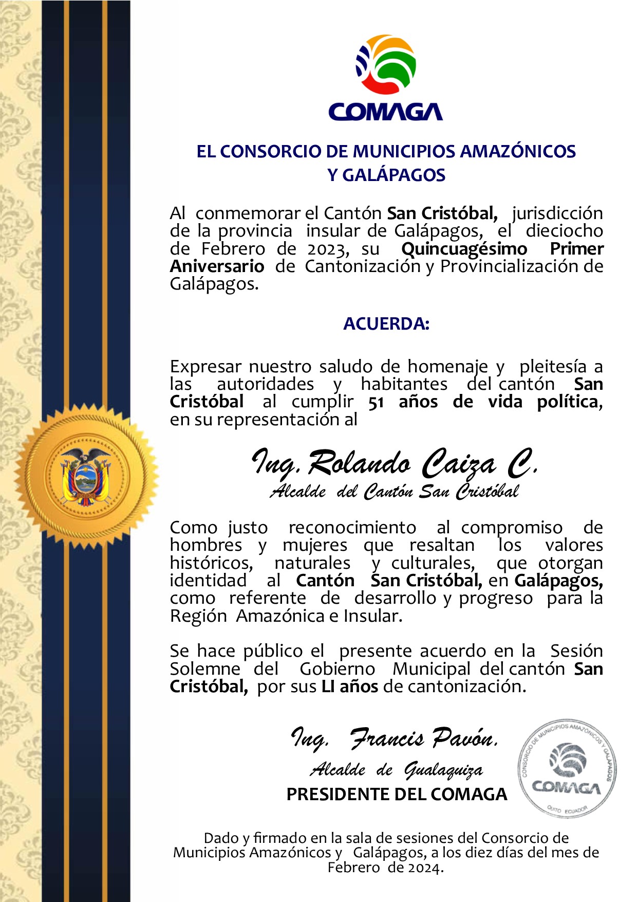 El Consorcio de Municipios Amazónicos y Galápagos, COMAGA reitera su homenaje a San Cristóbal en la Provincia Insular de Galápagos al celebrar este 18 de febrero su 51 aniversario de cantonización y saluda al noble pueblo de San Cristóbal por intermedio de su Alcalde Ing. Rolando Caiza.