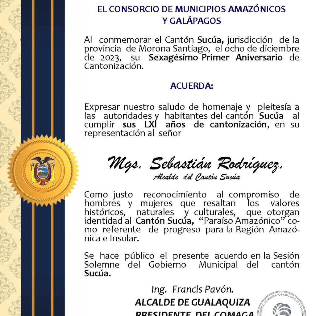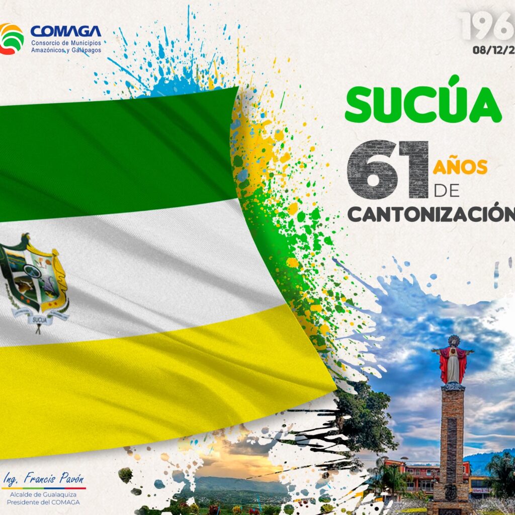 El Consorcio de Municipios Amazónicos y Galápagos COMAGA rinde homenaje a Sucúa al celebrar el sexagésimo primer aniversario de cantonización y saluda al noble pueblo del Paraíso Amazónico, por intermedio de su Alcalde Mgs. Sebastián Rodríguez.