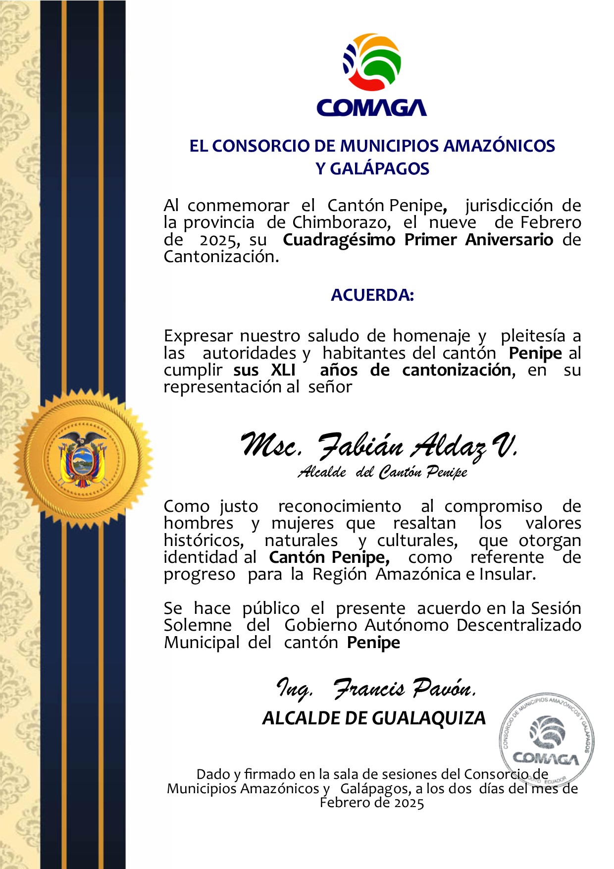 El Consorcio de Municipios Amazónicos y Galápagos (COMAGA) rinde homenaje a Penipe en sus 41 años de cantonización y saluda al noble pueblo de Penipe por intermedio de su Alcalde Fabián Aldaz, así como a sus concejales.