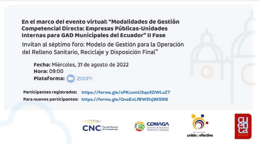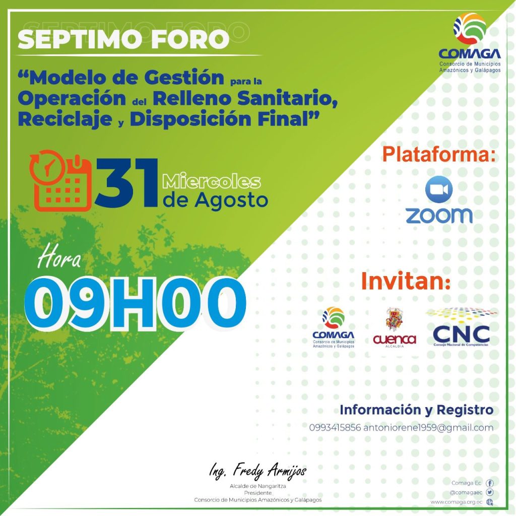 #COMAGAcapacitación//El Consorcio de Municipios Amazónicos y Galápagos, COMAGA en coordinación con el Consejo Nacional de Competencias y la Municipalidad de Cuenca, realizan el Séptimo Foro "Modelo de Gestión para la Operación del Relleno Sanitario, Reciclaje y Disposición Final" de manera virtual este miércoles 31 de agosto a las 09h00.