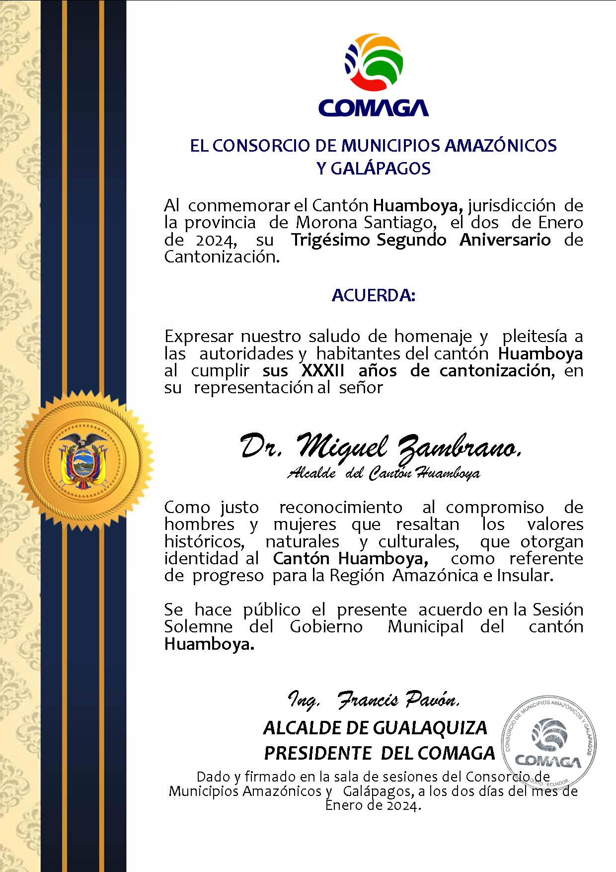 #Efemérides//El Consorcio de Municipios Amazónicos y Galápagos rinde homenaje a Huamboya en la provincia de Morona Santiago, al celebrar su trigésimo segundo aniversario de cantonización y saluda al noble pueblo trabajador por intermedio de su Alcalde, Dr. Miguel Zambrano.