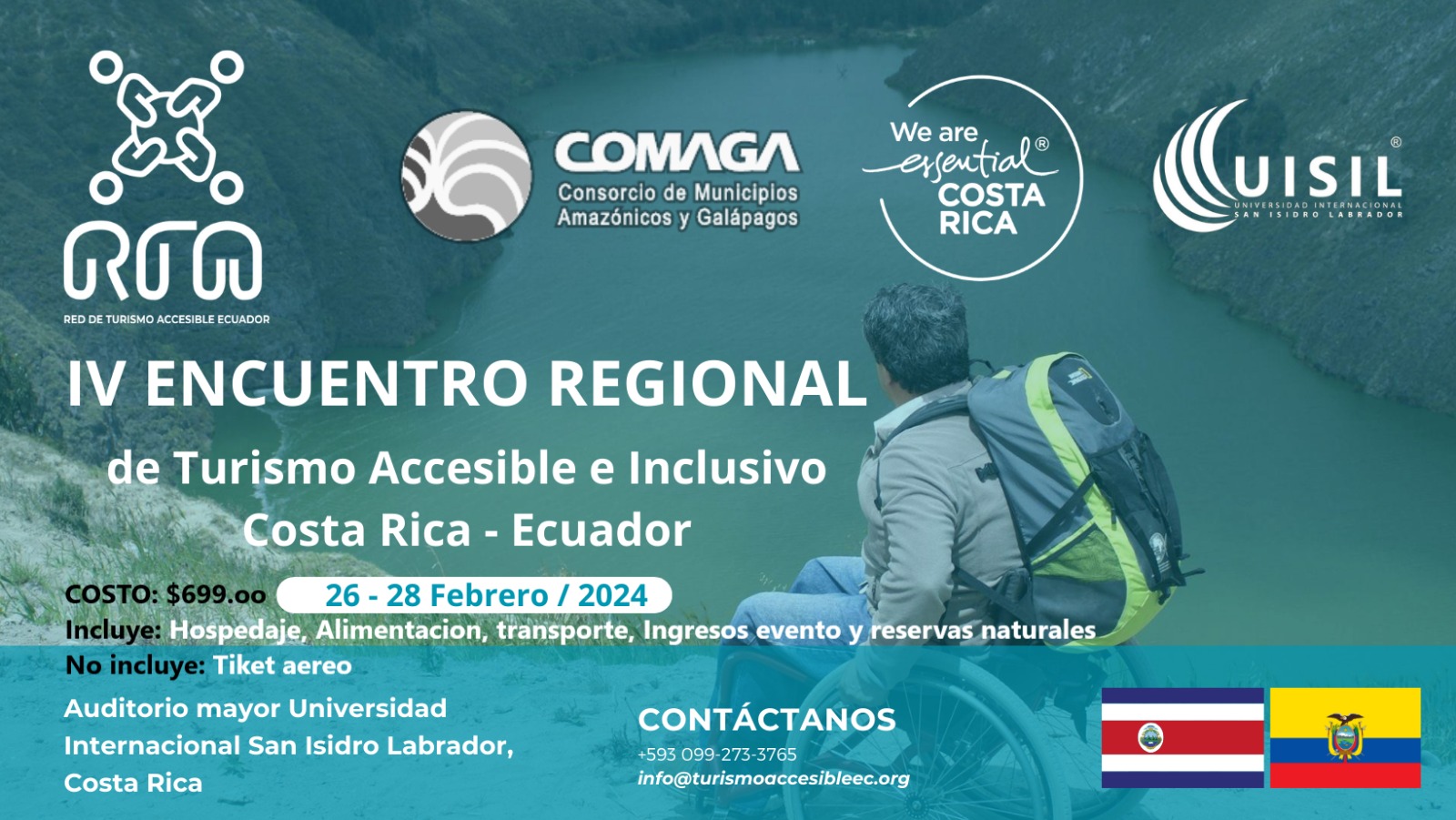 El Consorcio de Municipios Amazónicos y Galápagos en coordinación con la Red de Turismo Accesible del Ecuador, comparten la invitación a las autoridades de los Gobiernos Autónomos Descentralizados Municipales asociados, a participar del “IV ENCUENTRO REGIONAL DE TURISMO ACCESIBLE E INCLUSIVO” - UISIL - COSTA RICA - ECUADOR 2024” 26 AL 28 febrero – 2024, mismo que se realizará en la ciudad de Pérez Zeledón en Costa Rica; con la anuencia de la Universidad Internacional San Isidro Labrador UISIL, como institución anfitriona local de este evento.