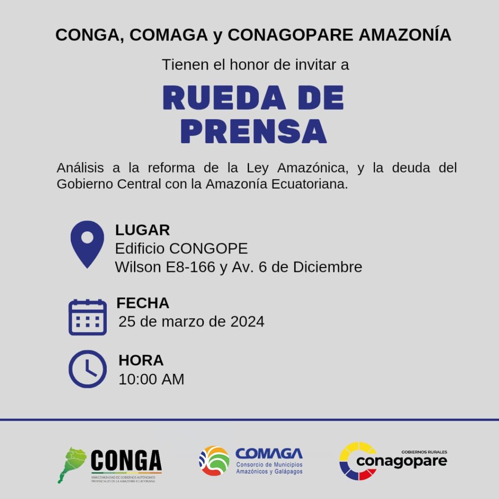 𝐈𝐍𝐕𝐈𝐓𝐀𝐂𝐈Ó𝐍 𝐚 𝐫𝐮𝐞𝐝𝐚 𝐝𝐞 𝐩𝐫𝐞𝐧𝐬𝐚: las autoridades del Consorcio de Municipios Amazónicos, COMAGA - de la Mancomunidad de Gobiernos Autónomos Provinciales de la Amazonía Ecuatoriana, CONGA - el Consejo Nacional de Gobiernos Parroquiales Rurales del Ecuador, CONAGOPARE - invitan a la rueda de prensa para el lunes 25 de marzo, 10h00- en el auditorio del CONGOPE en Quito, Wilson E8 -166 y Av. 6 de Diciembre. 𝑻𝒆𝒎𝒂: 𝗔𝗻á𝗹𝗶𝘀𝗶𝘀 𝗱𝗲 𝗹𝗮 𝗥𝗲𝗳𝗼𝗿𝗺𝗮 𝗮 𝗹𝗮 𝗟𝗲𝘆 𝗔𝗺𝗮𝘇ó𝗻𝗶𝗰𝗮 𝗟𝗢𝗣𝗜𝗖𝗧𝗘𝗔 𝘆 𝗹𝗮 𝗱𝗲𝘂𝗱𝗮 𝗱𝗲𝗹 𝗚𝗼𝗯𝗶𝗲𝗿𝗻𝗼 𝗖𝗲𝗻𝘁𝗿𝗮𝗹 𝗮 𝗹𝗼𝘀 𝗚𝗔𝗗 𝗱𝗲 𝗹𝗮 𝗔𝗺𝗮𝘇𝗼𝗻í𝗮.