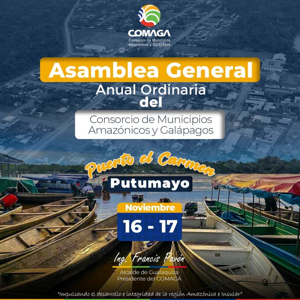 #AsambleaCOMAGA//El Consorcio de Municipios Amazónicos y Galápagos, COMAGA invita a participar de su Asamblea General Ordinaria que se realizará el 16 y 17 de noviembre de 2023 en el Cantón Putumayo, Sucumbíos.