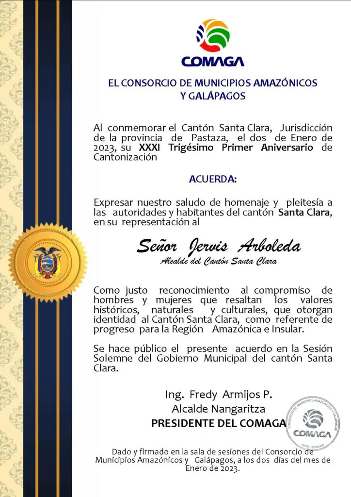 #Efemérides// El COMAGA rinde homenaje a Santa Clara al celebrar este dos de enero, su trigésimo primer aniversario de cantonización y saluda al noble pueblo trabajador por intermedio de su Alcalde Jervis Arboleda y su cuerpo edilicio.