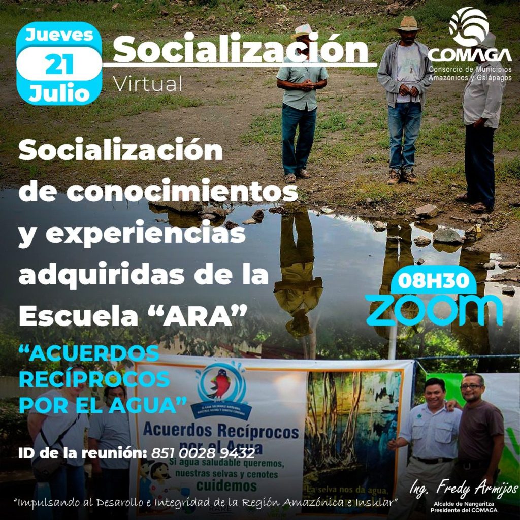 Este jueves 21 de julio realizaremos la socialización de conocimientos y experiencias en la escuela ARA -Acuerdos Recíprocos por el Agua - de Bolivia sobre la protección de las fuentes de agua, permitiendo tener una visión de sostenibilidad de este recurso vital para la humanidad. Invitados a la capacitación virtual los funcionarios de los Gobiernos Autónomos Descentralizados Municipales asociados al Consorcio de Municipios Amazónicos y Galápagos.