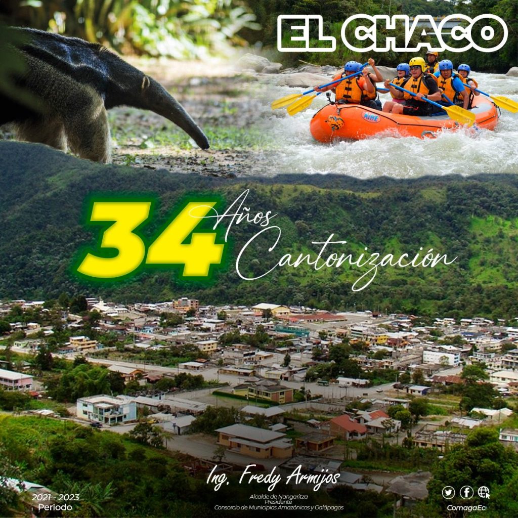 El Consorcio de Municipios Amazónicos y Galápagos rinde homenaje a El Chaco al celebrar su trigésimo cuarto aniversario de cantonización y saluda a su noble pueblo trabajador por intermedio de su Alcalde Ing. Javier Chávez y de su cuerpo edilicio. Loor a El Chaco en la provincia de Napo.